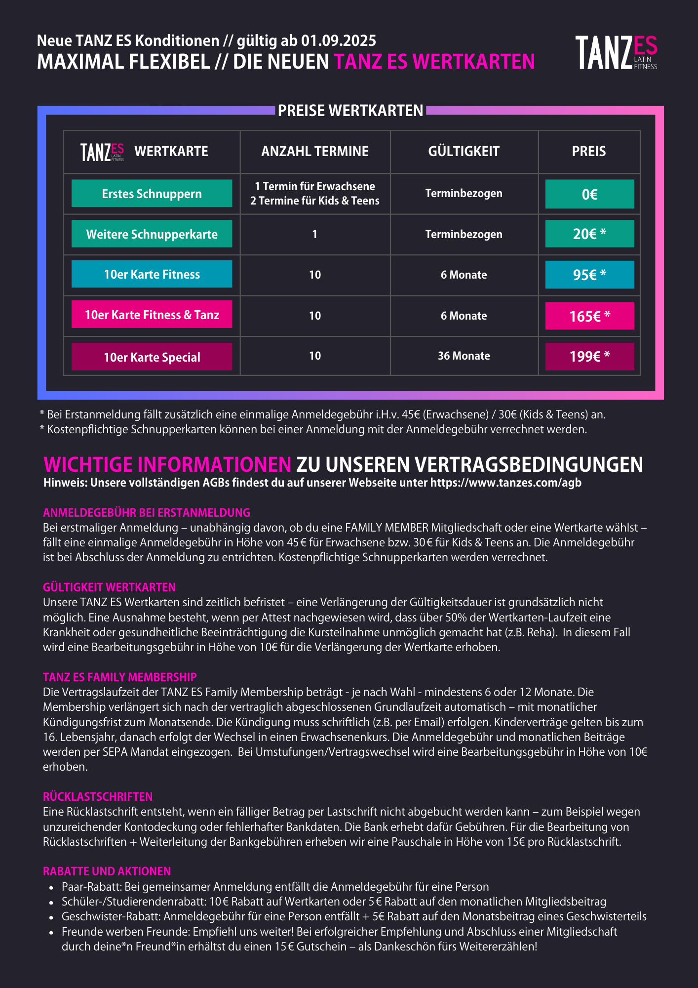 TANZ ES ist mehr als eine Tanzschule – wir sind ein Ort für Bewegung, Begegnung und Gemeinschaft. Ob Paartanz, Solo Tanz, Kurse für Fitness oder Kids & Teens - bei uns findest du genau das, was zu dir passt. Hier erhältst du einen Überblick über unsere aktuellen Preise und Möglichkeiten. Werde jetzt Teil unserer TANZ ES Community. Wir freuen uns auf dich!