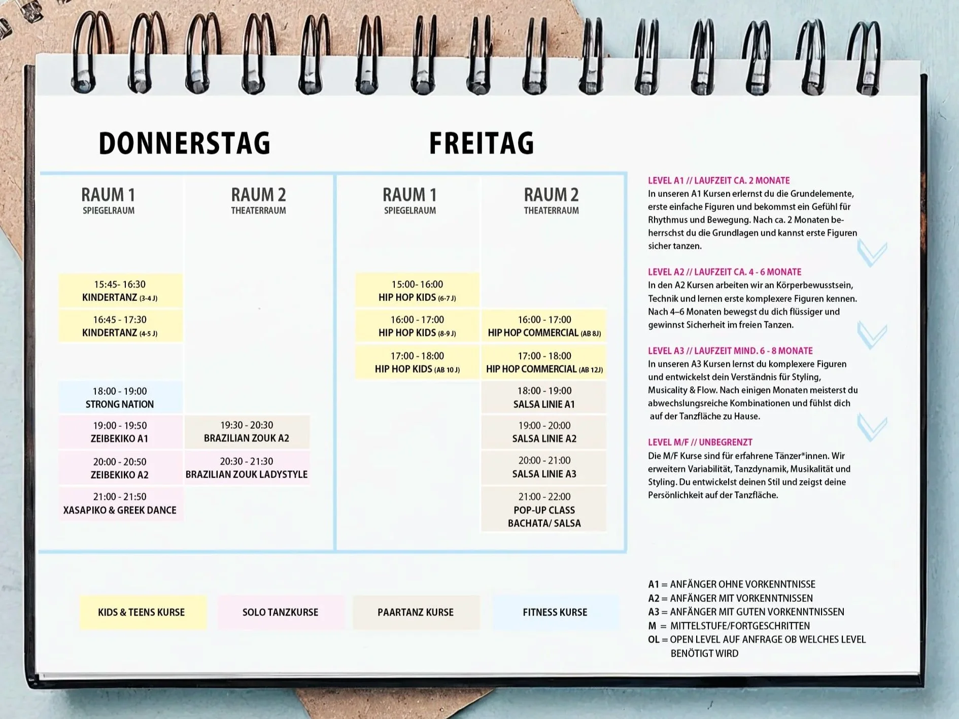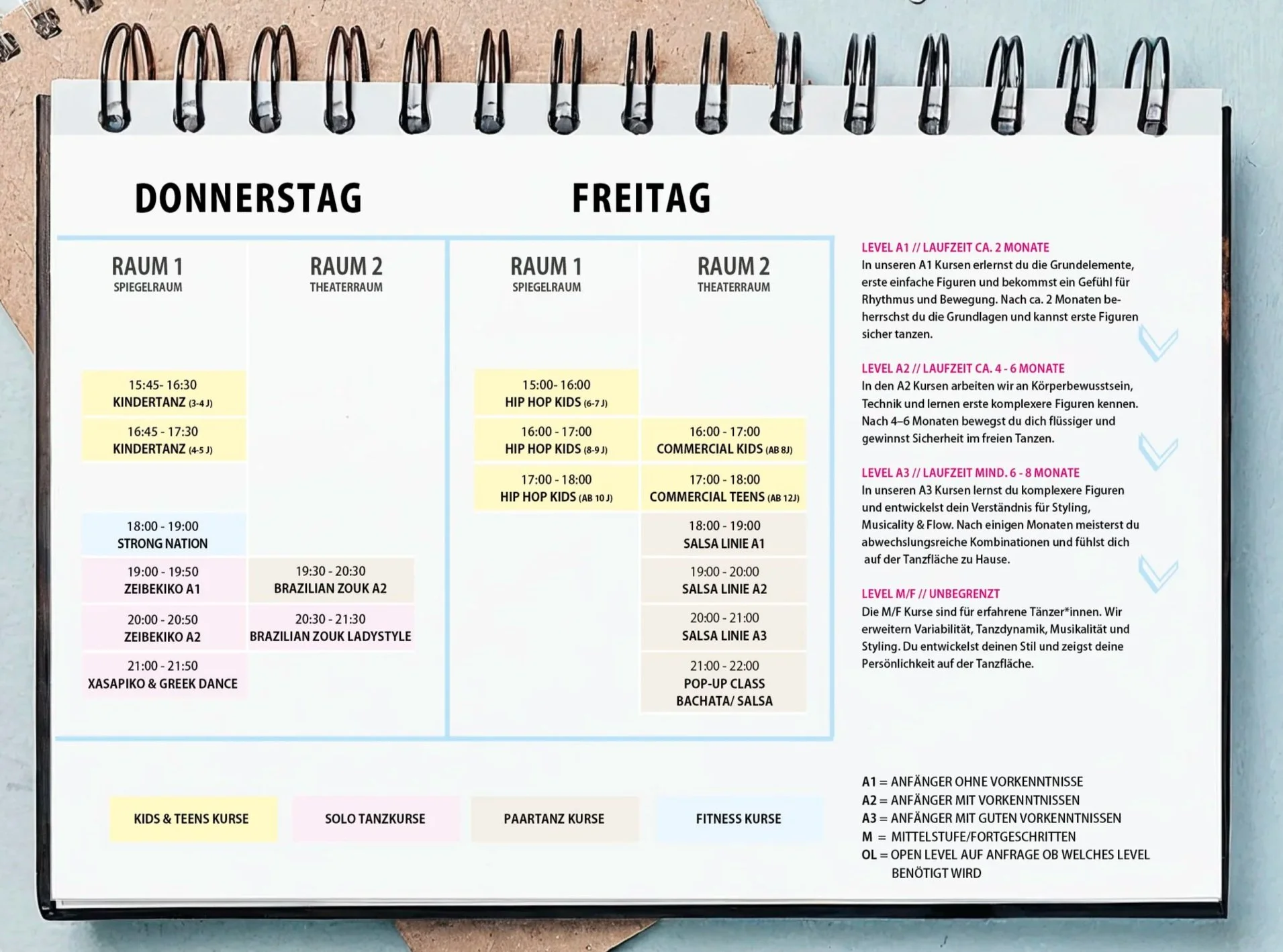 Hier bekommst du den Überblick über all unsere Tanz- und Fitnesskurse. Ob du regelmäßig trainierst oder einfach mal reinschnuppern willst – bei uns findest du das passende Angebot für dein Level, deinen Style und deinen Zeitplan. Unser Team aus professionellen Trainer:innen und Tanzlehrer:innen begleitet dich mit Leidenschaft, Know-How und guter Energie durch jede Stunde.