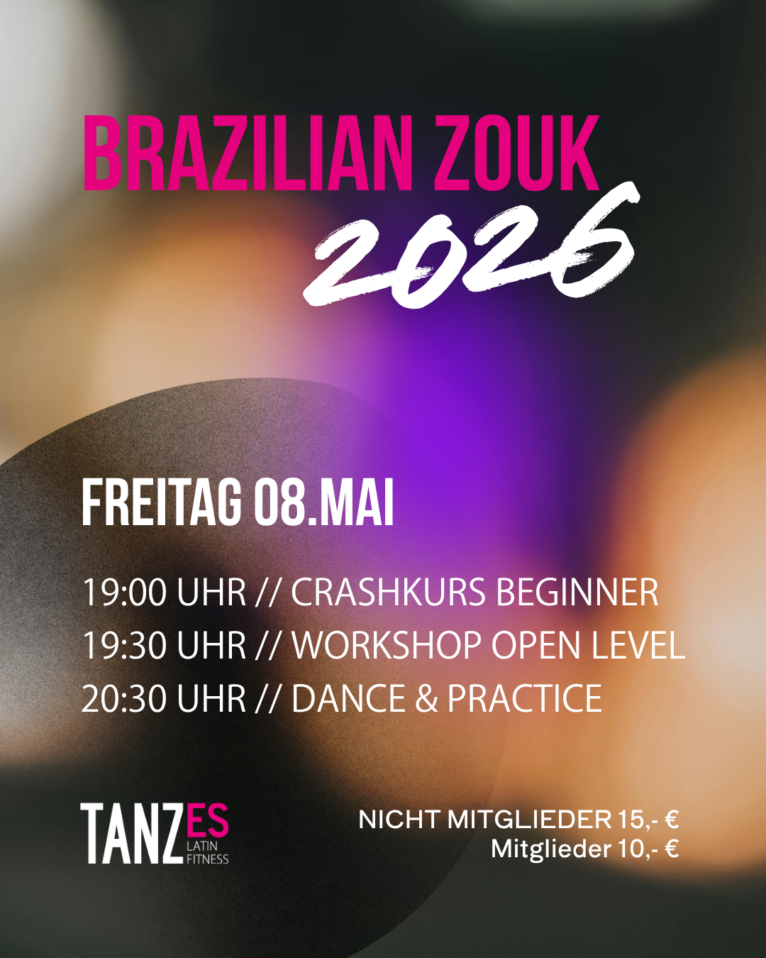 Datum: 08.05.2026, ab 19:00 Uhr Ort: TANZ ES, Blumenstr. 15, 73728 Esslingen Preis: 15€ (10€ für TANZ ES Mitglieder) Getränke: Gerne selbst mitbringen.