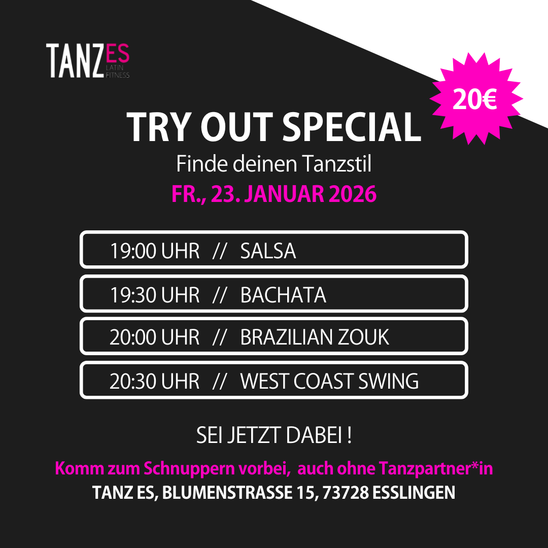 Am Freitag, den 23. Januar 2026 findet unser großes Try-Out Special statt. In kurzen Tanzsequenzen hast du die Möglichkeit, die Besonderheiten eines jeden Tanzstils kennenzulernen.
