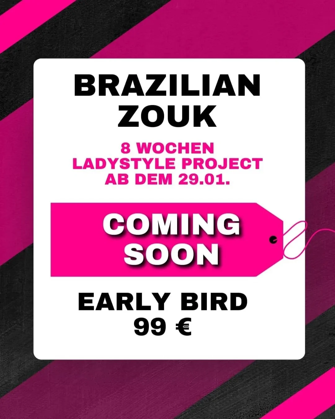 Social Dance meets Choreo - In unserem 8-wöchigen Brazilian Zouk Project erlebt ihr ein intensives Training, in dem ihr nicht nur als Einzelperson, sondern auch als Tanzgemeinschaft wachst. Mit Elementen aus dem Social Dance trainieren wir zusammen eine Ladystyle Choreo und zeigen euch, wie ihr Präsenz und Ausdruckskraft auf der Tanzfläche gewinnt.